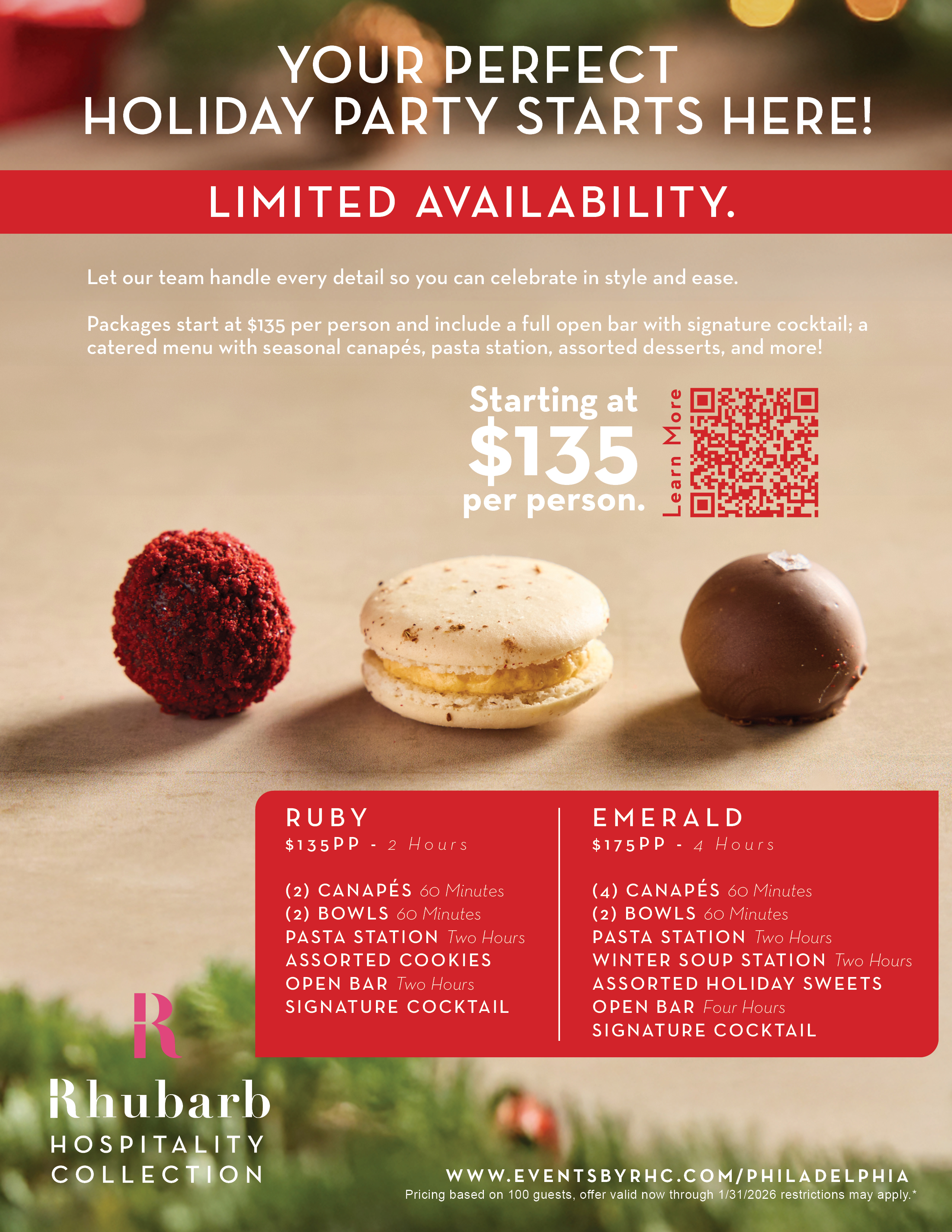 Our holiday menus bring together the best of the season with a perfect balance of tradition and creativity. Start with refined small bites, like beef bourguignon croquette, then savor holiday inspired pastas , or an optional winter soup station. End on a sweet note with one of our signature desserts designed to wow every guest, and did we mention full open bars?
