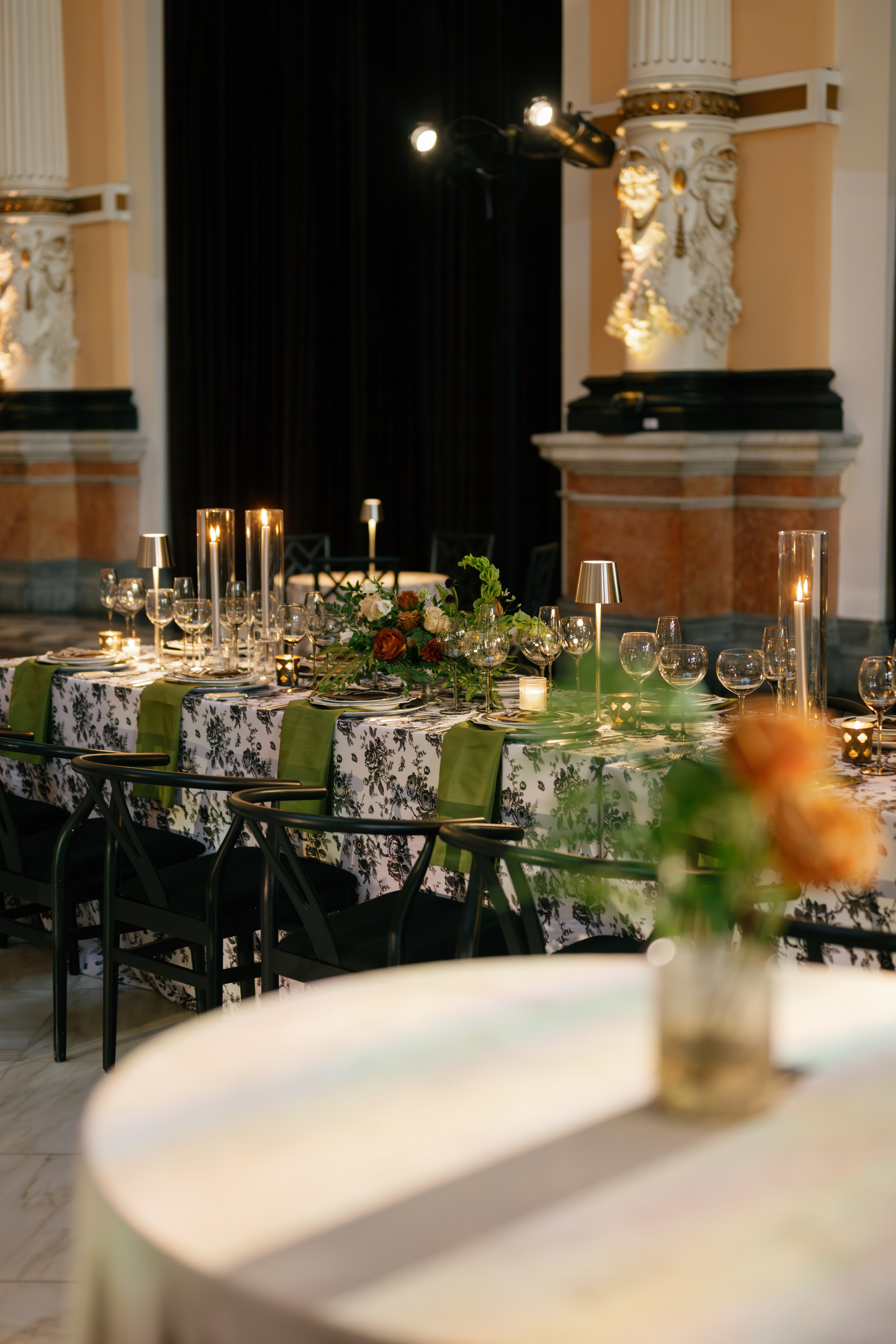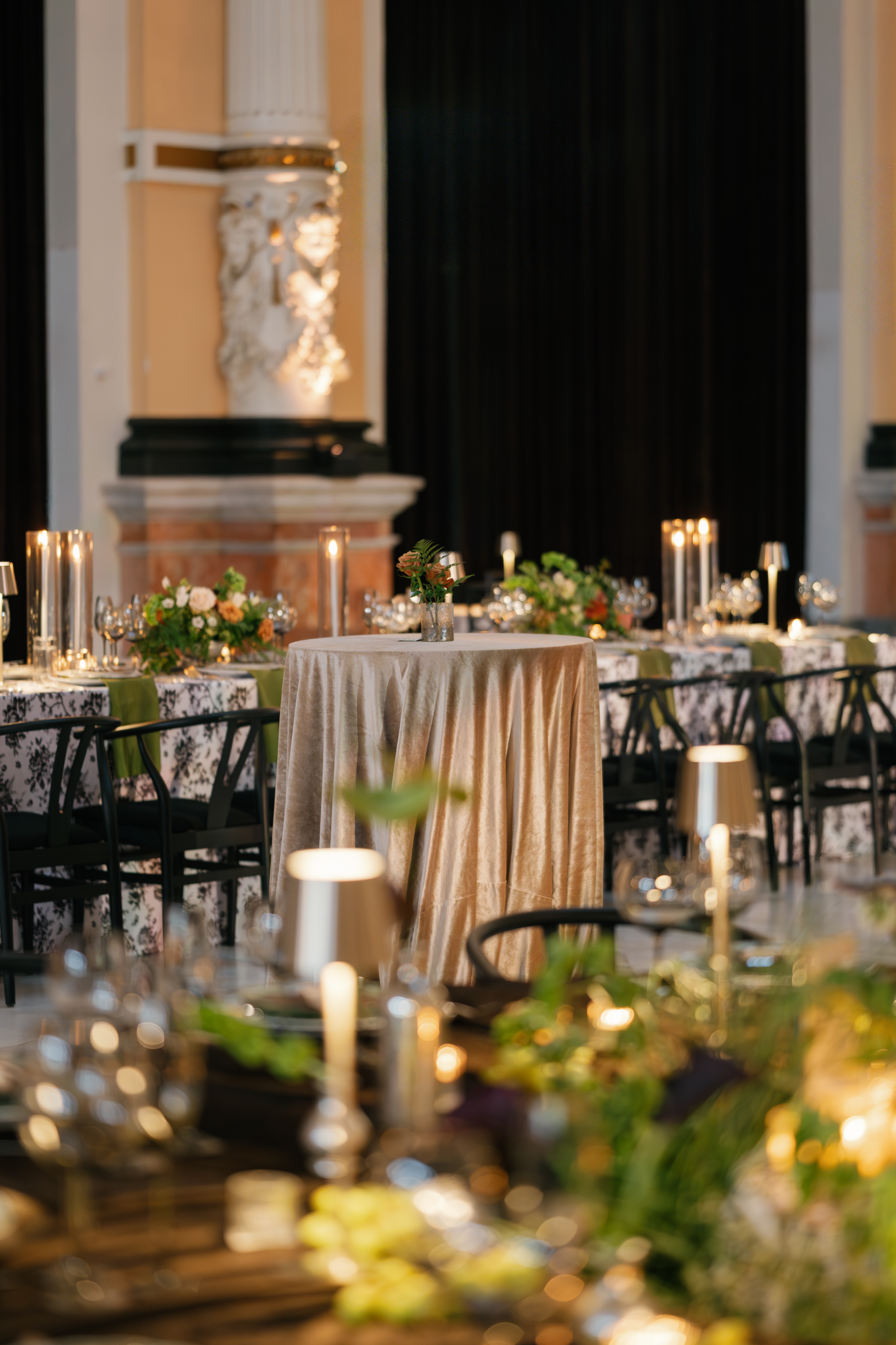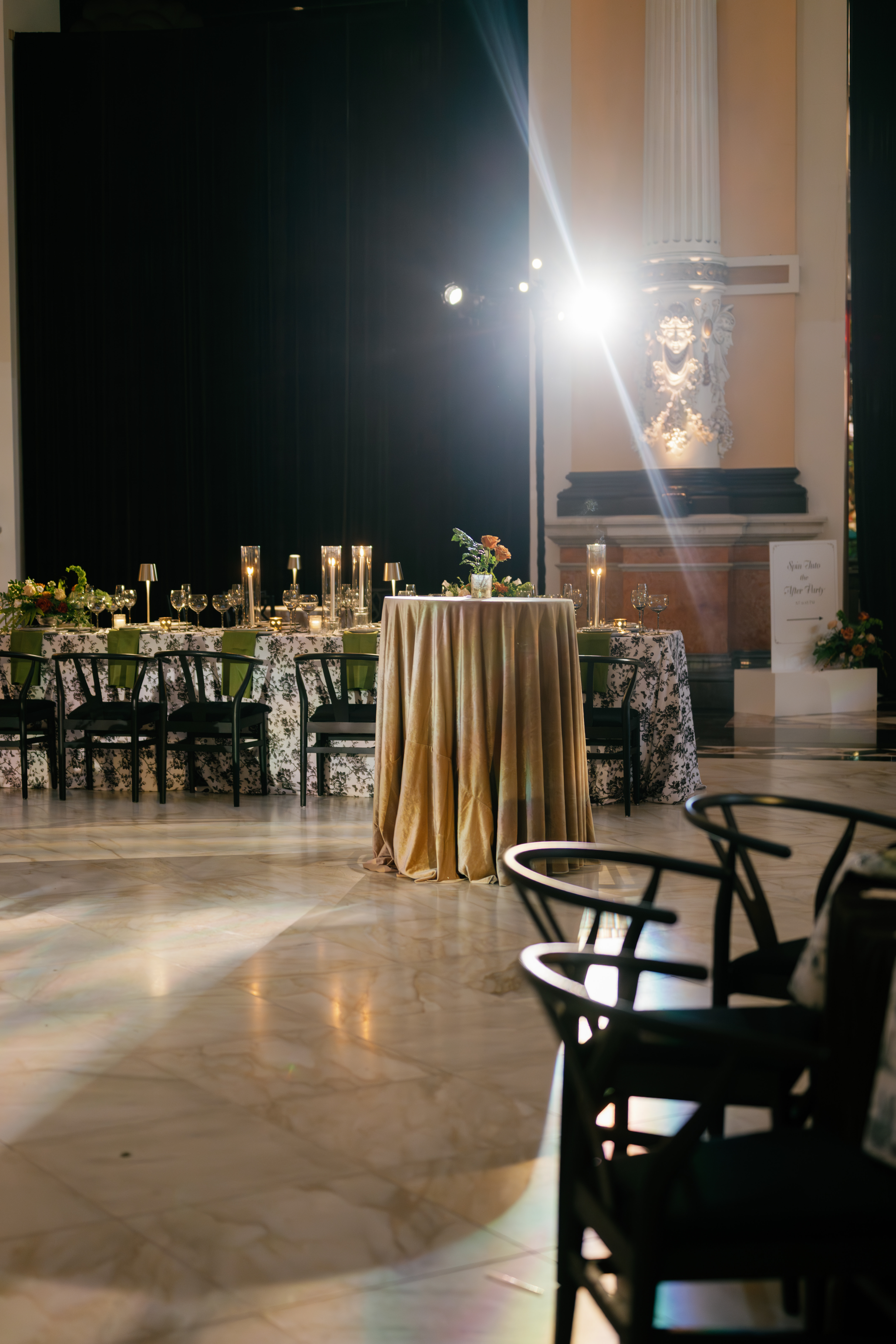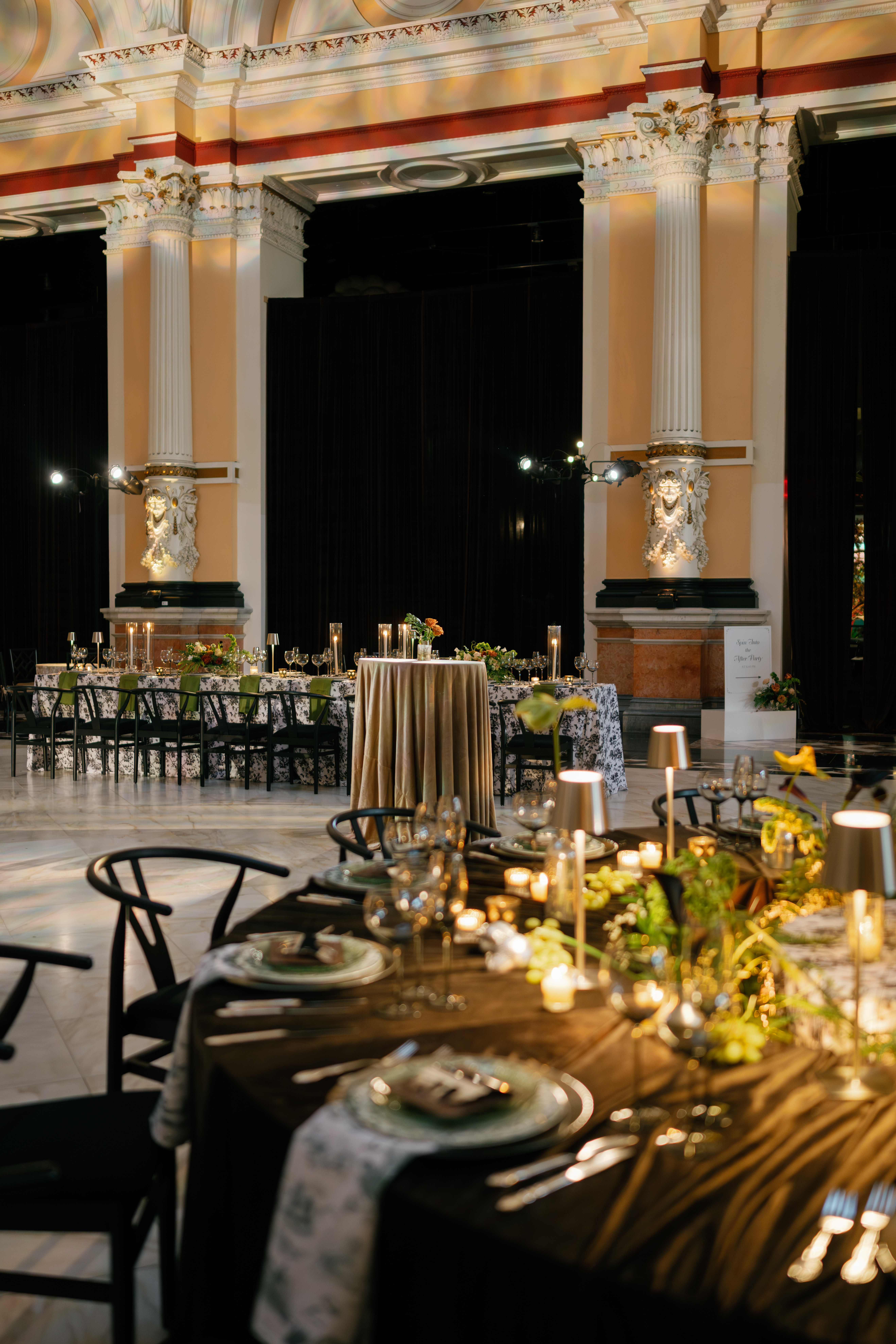 Creative direction was led by All About Events, who reimagined the space through architectural draping, sculptural florals, warm lighting, and elevated table design.