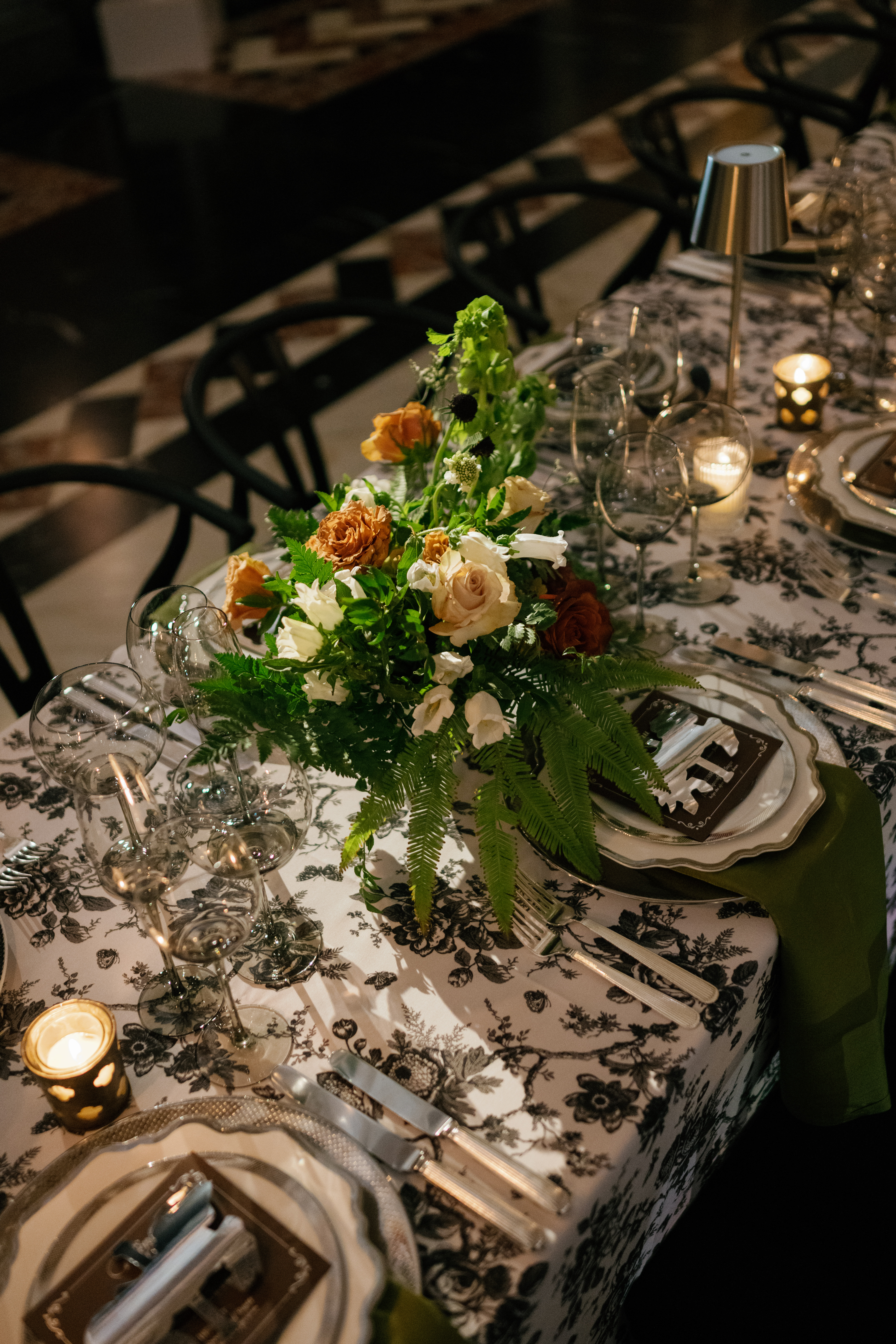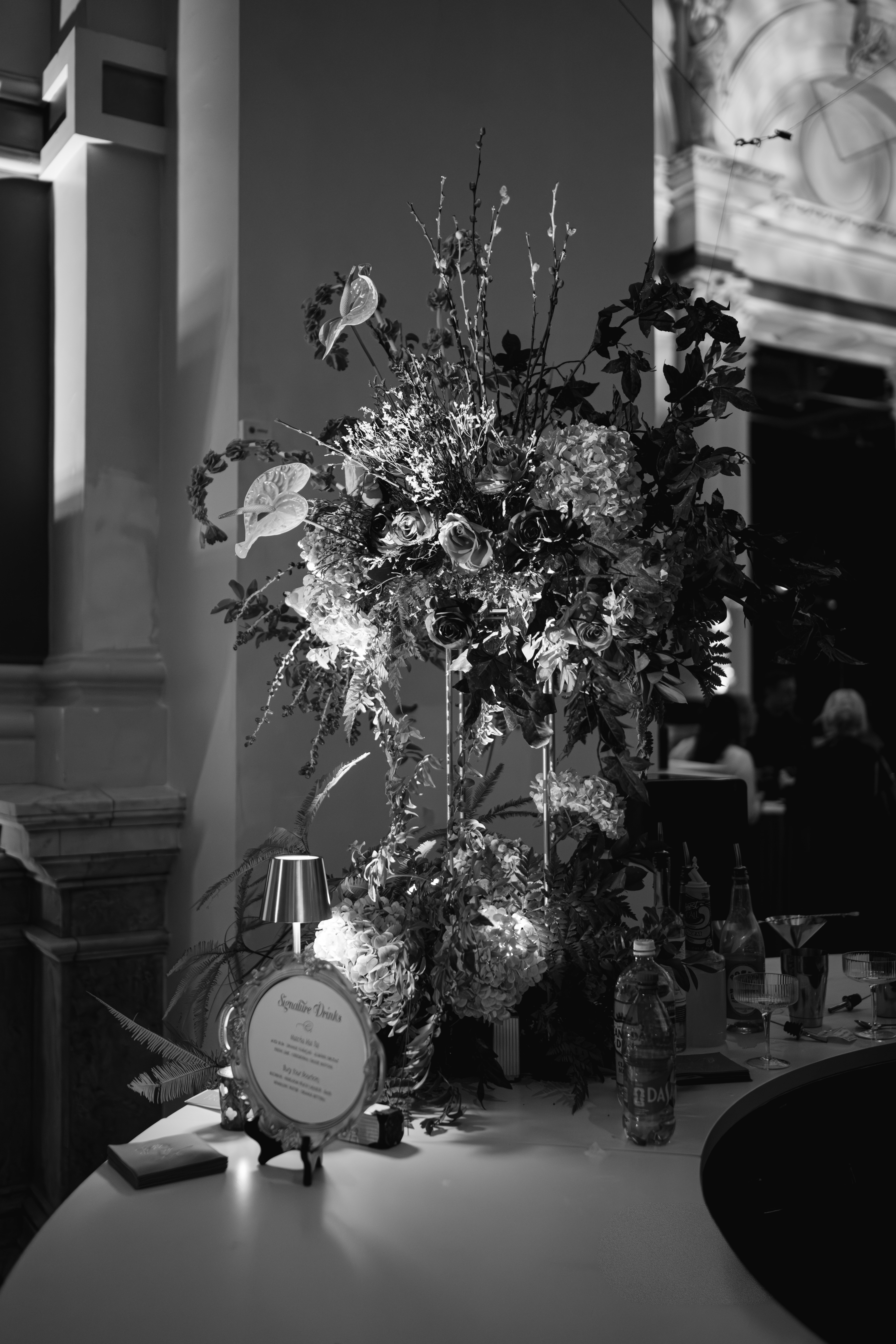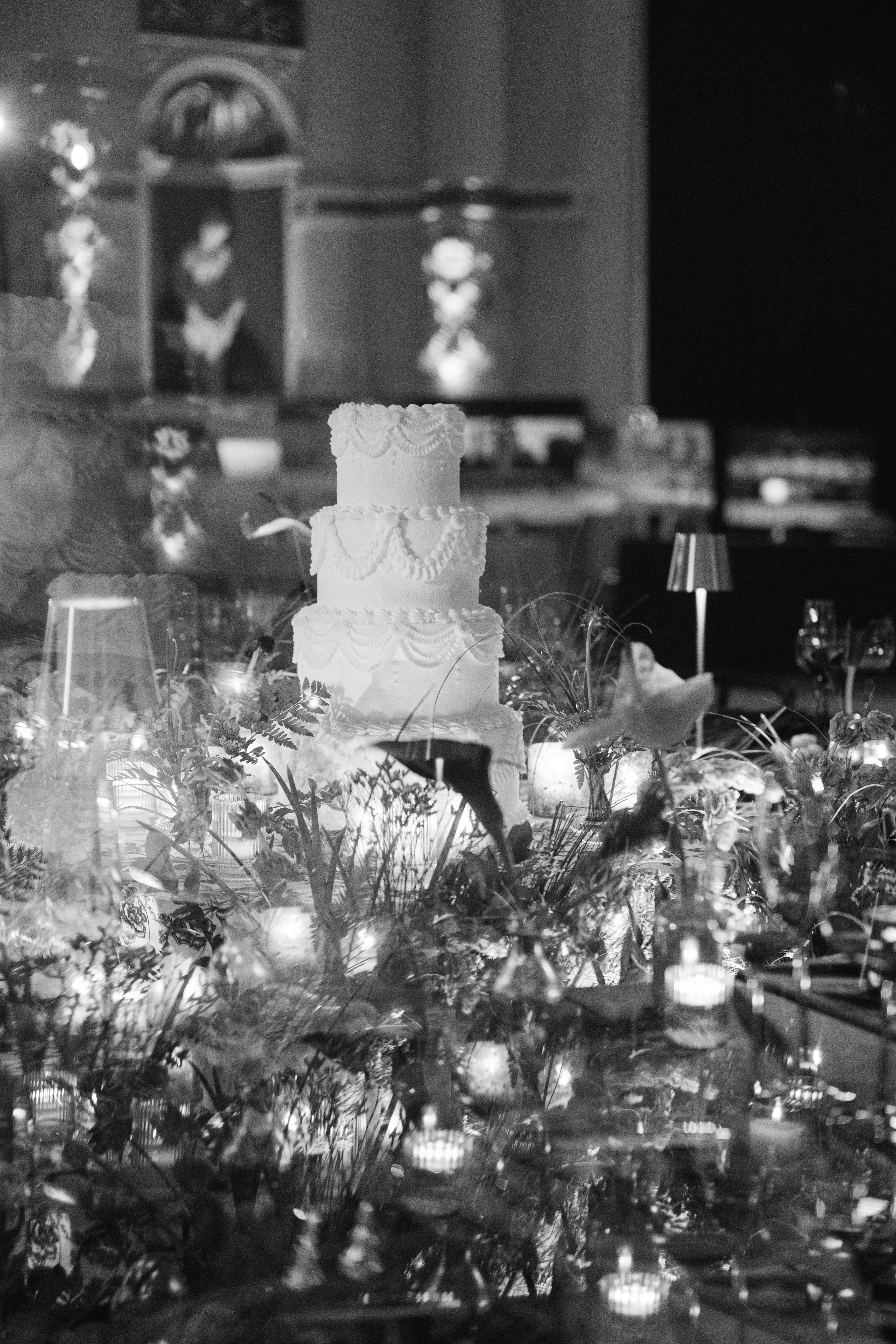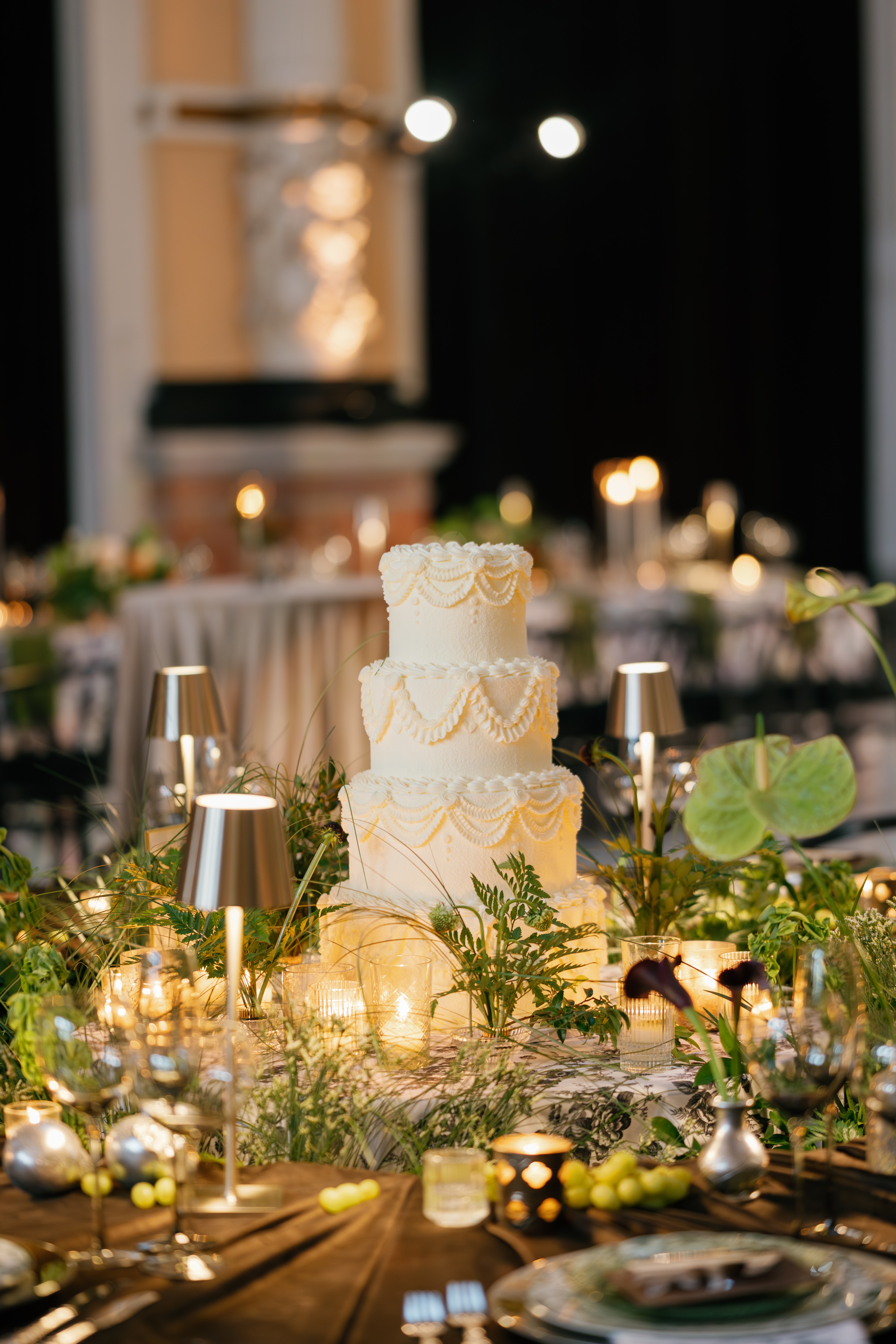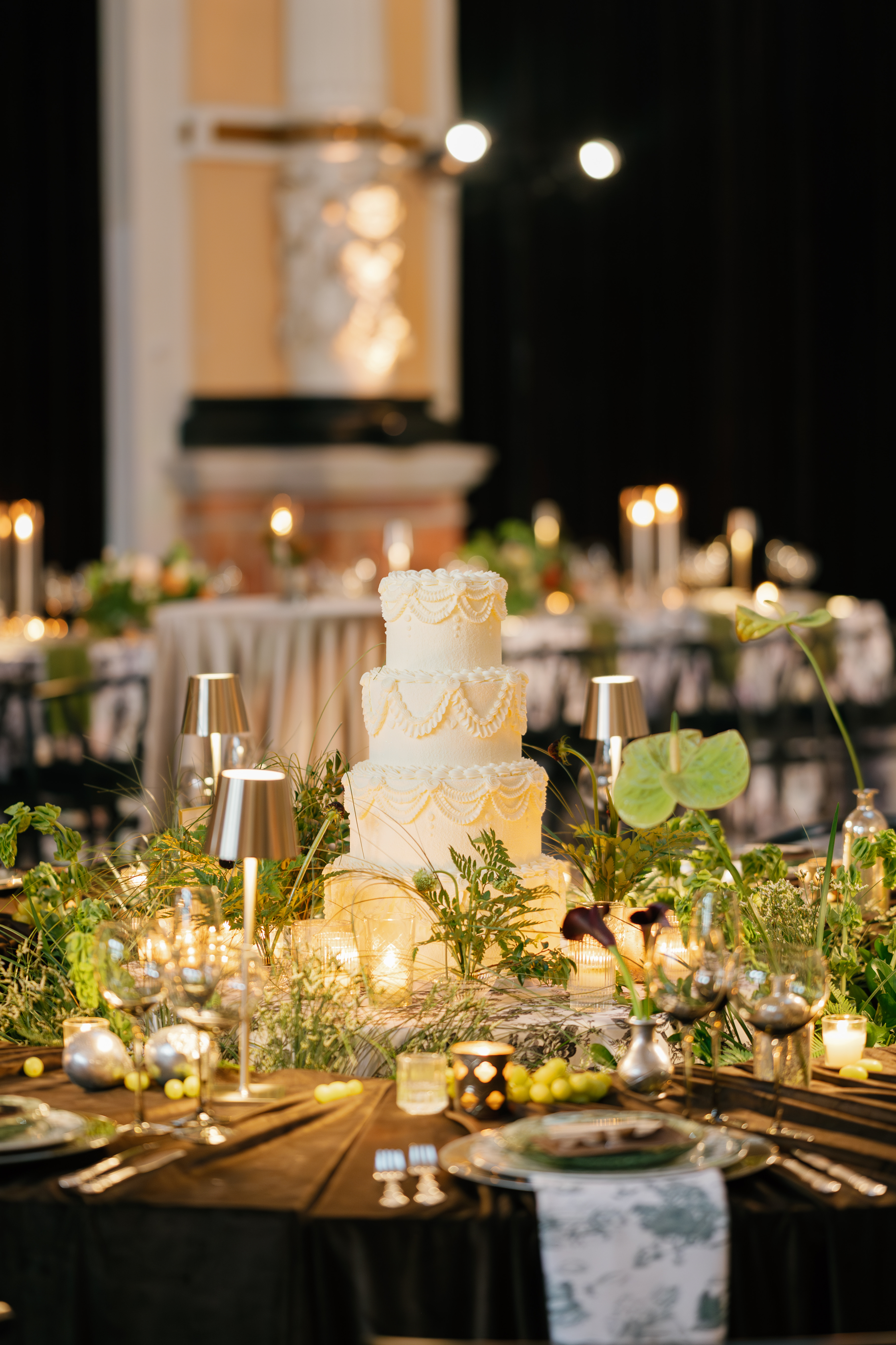 Creative direction was led by All About Events, who reimagined the space through architectural draping, sculptural florals, warm lighting, and elevated table design.